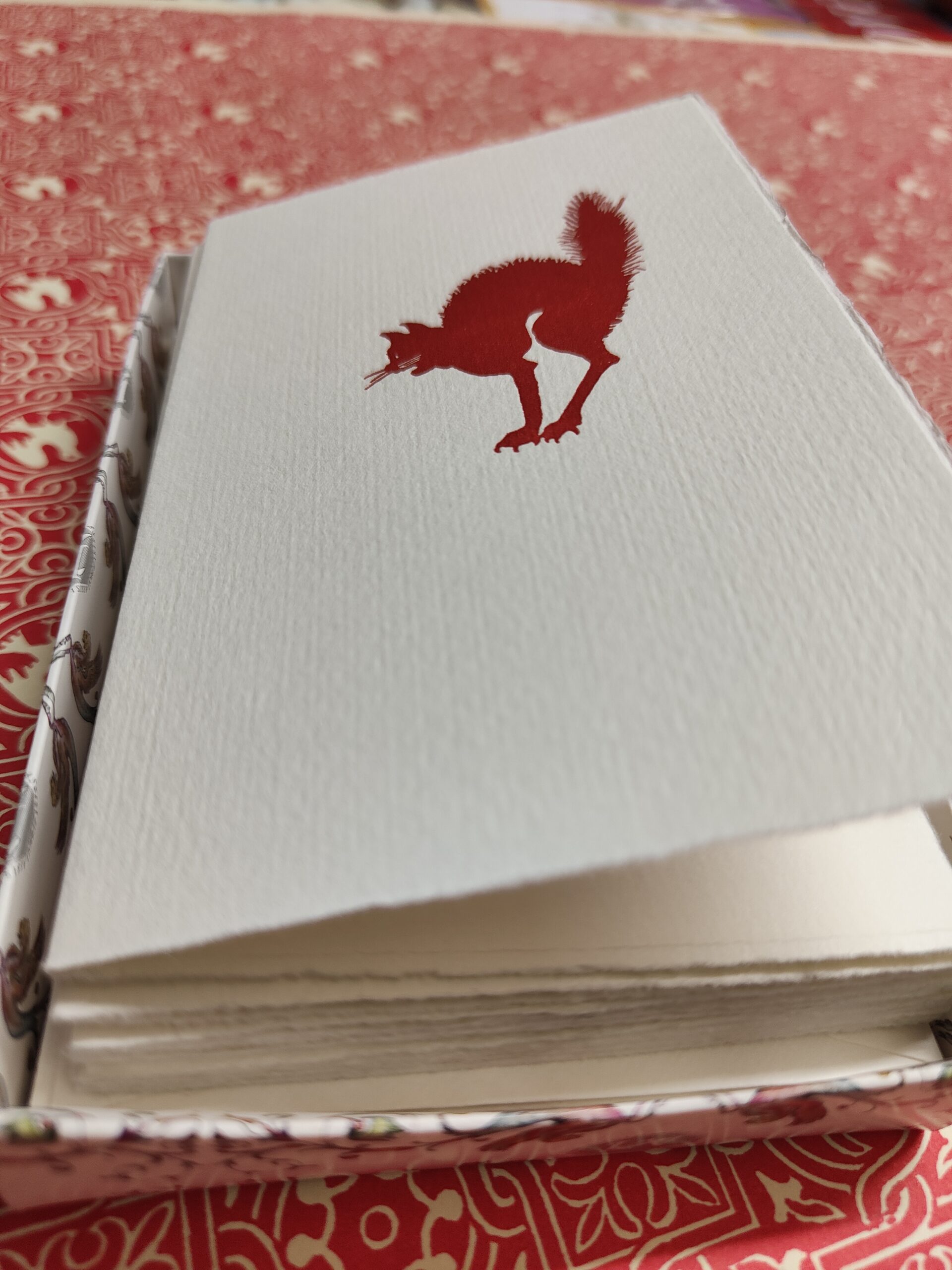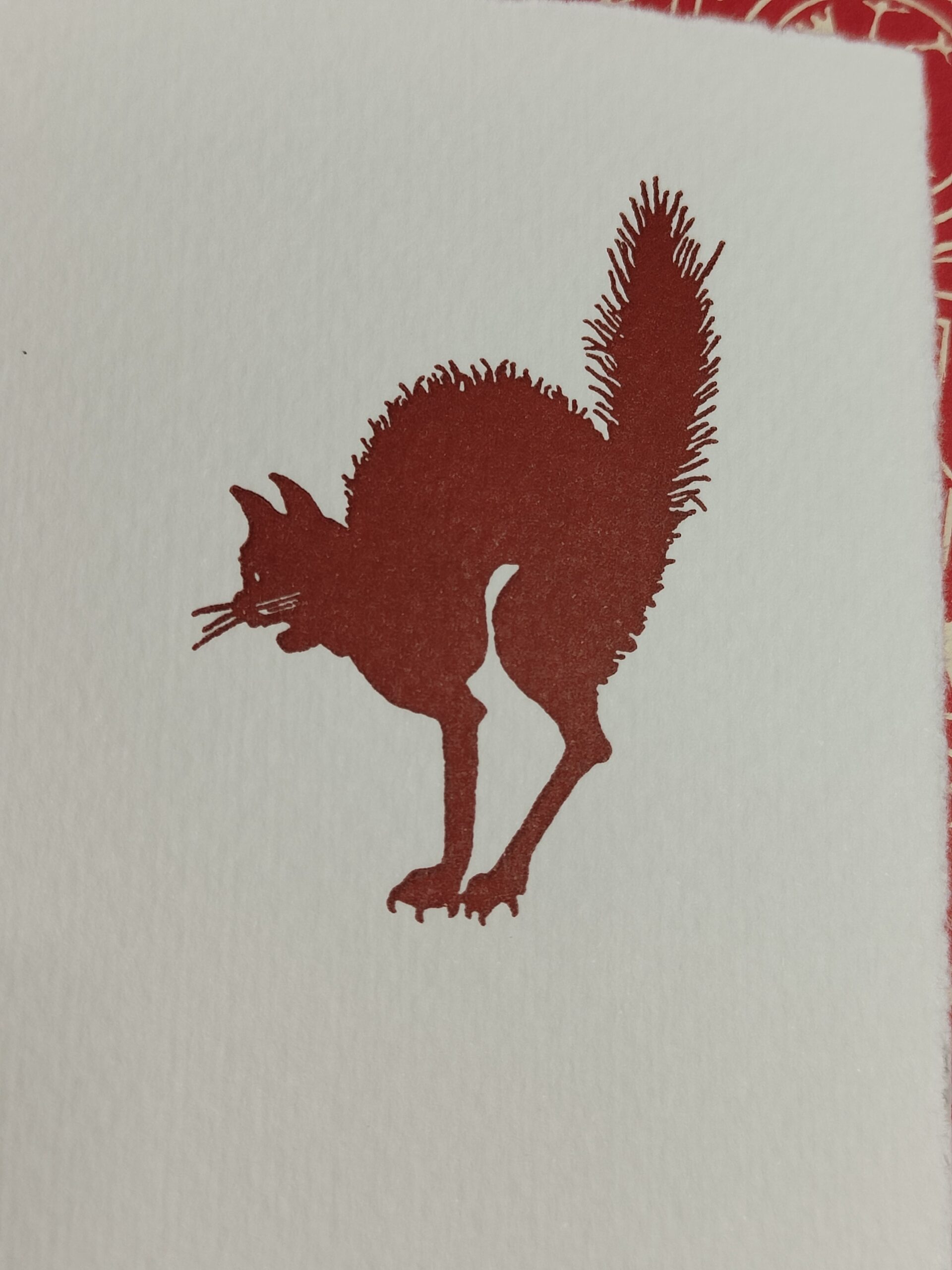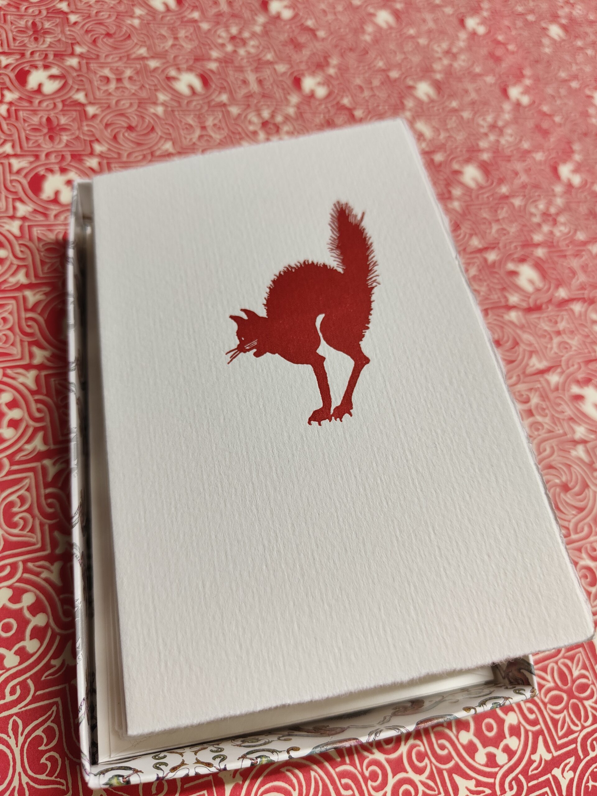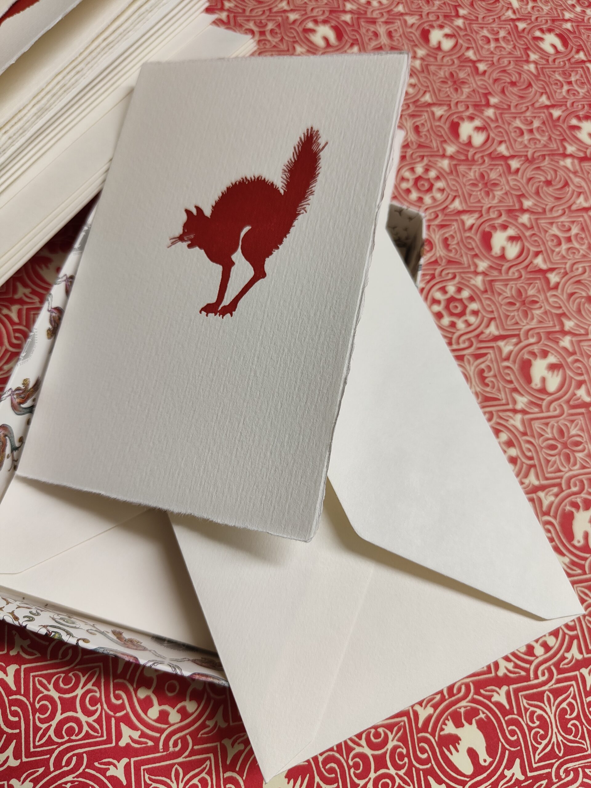 Serie pregiata di biglietti artistici stampati tipograficamente ad inchiostro color rosso carminato , utilizzando alcuni dei nostri cliché tipografici più preziosi e di nuova grafica , in questo caso un simpatico gatto ingrifato realizzato da un disegno a china e poi passato su matrice tipografica in Stella Heidelberg.