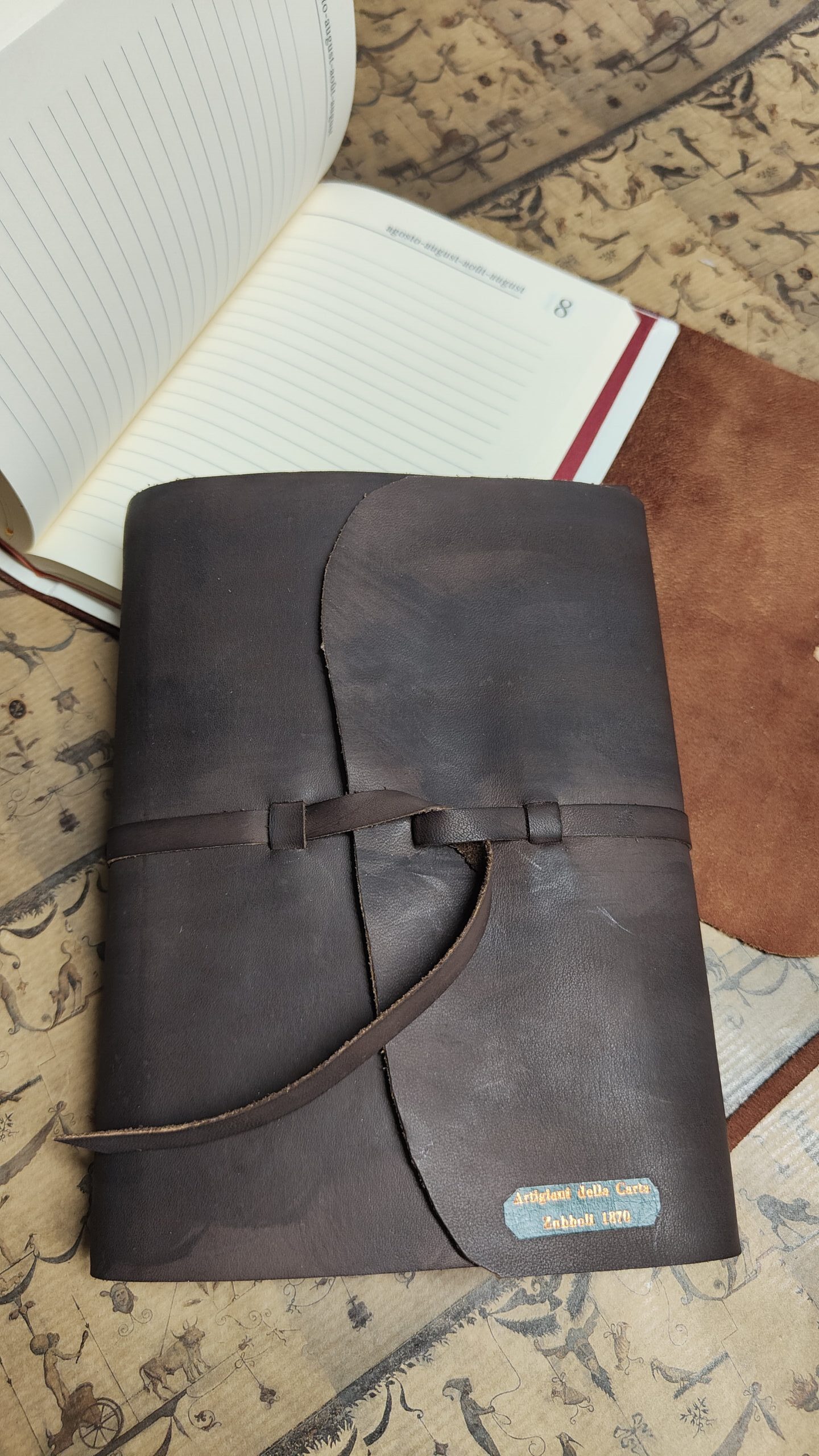 La pelle dell ‘ agenda giornaliera/perpetua può essere scelta tra tinte di vari colori : Rosso, Nero, Marrone , Naturale , Verde e Blu Avio ; si prega cortesemente di specificare nella compilazione del form al momento dell’ordine il colore della tinta per realizzare la copertina estraibile ; vi è anche la possibilità di incidere in oro a caldo le Iniziali o il proprio Nome come personalizzazione speciale….magari per un regalo.